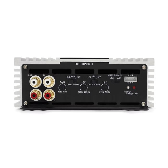 - 2-Channel, Full Range, Class A/B - Tiffany style Panel Mount RCA - Speaker Level Inputs - Variable input gain control - Variable electronic crossover - Auto-on with Speaker level inputs - Variable bass boost control - New aluminum chassis